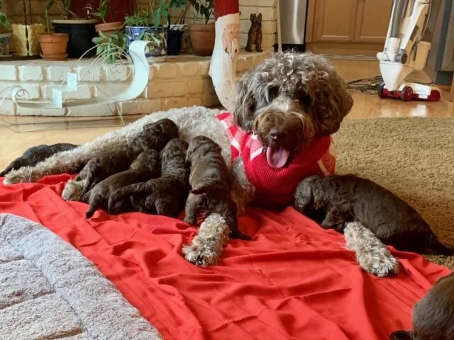 This beautiful litter is going to fall into the 35-50 pound range in solid chocolates with wavy fleece coats. I am really excited about this litter because of the parents involved. This is Fozzie's first litter and Cassie’s last. I was so thankful for the timing of this breeding and to be able blend the two before Cassie’s retirement and am hoping to keep back a couple of potential breeding prospects to carry on their amazing lines.. . This was a large litter of 12 pups who have all been thriving from the start. Everything about them is perfect.. their coats are going to be amazing, and I know the temperaments will be too. This litter will be spayed/neutered, microchipped and health checked by our vet before leaving. This litter will be going home in mid January. Please go to our pricing link for payment information